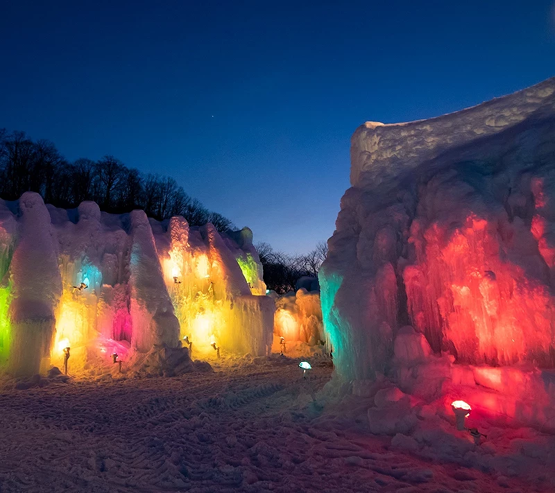 「層雲峽溫泉冰瀑節」2025年迎來第50屆,在冰雪覆蓋的峽谷裡打造巨型冰雕、冰洞與冰湖等場景,並在夜間點燈後以彩色燈光映照出如童話般的冰之世界。現場除了欣賞冰瀑與光雕外,還有冰迷宮、冰酒吧、拍照體驗屋與滑雪圈等互動設施,同時也有太鼓、愛努舞蹈與煙火演出,讓人沈浸在北國冬夜的魅力之中,留下難忘的回憶。