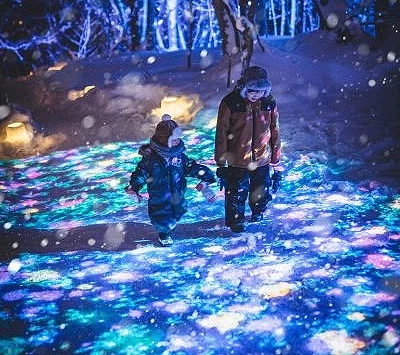 北海道道東的人氣點燈活動「彩凜華」以十勝川溫泉的雪原為舞台,在此設置圓錐、球體等各種形狀燈光裝置,隨著會場內播放的音樂節奏律動不停變換色彩,打造出如夢似幻的雪景。除了燈光秀之外,還能漫步浪漫的光之小徑、欣賞冬櫻點燈、體驗刺激的雪上漂流,或品嚐直徑24公分的巨大紅豆麵包,享受獨特的冬夜樂趣!