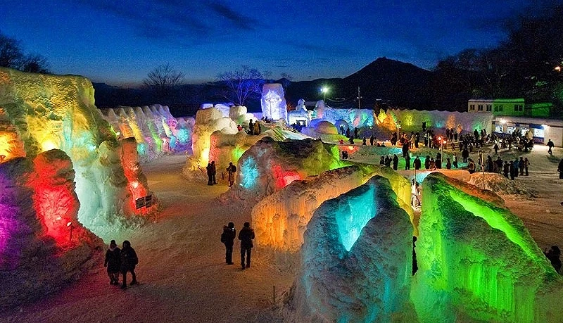 「千歲支笏湖冰濤節」利用支笏湖的湖水,透過噴水凍結技術打造出各式各樣的冰雕與冰之建築,呈現出獨特的「支笏湖藍」光澤。白天可欣賞自然光映照下的冰藍世界,夜晚則隨著多彩燈光變幻,營造出夢幻的彩雪景觀。此外,會場附近還有多處溫泉,推薦逛完冰濤祭再去泡個湯暖暖身,讓這趟冬季之旅更圓滿!