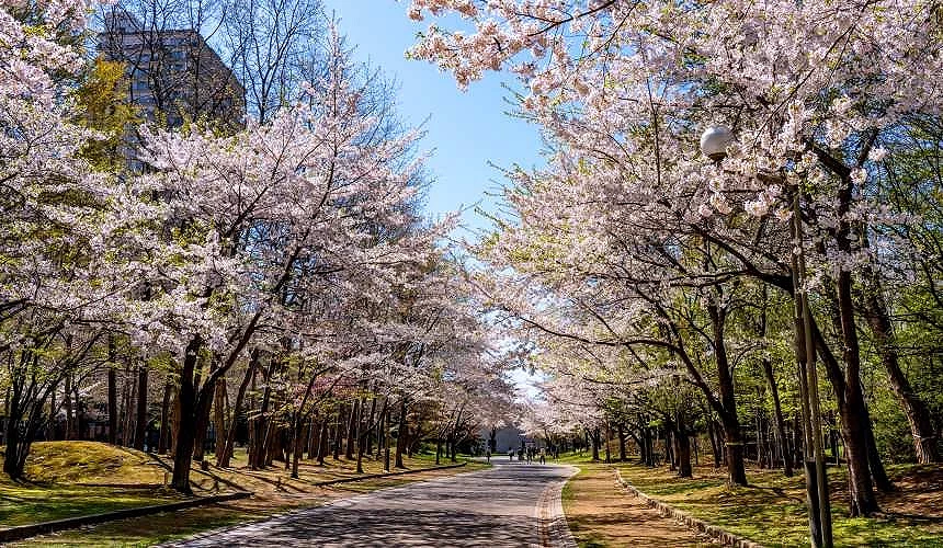 「中島公園」位在札幌市中心,緊鄰薄野繁華街,卻是鬧中取靜的桃花源。公園內共約種植了400棵櫻花木,有一般常見的吉野櫻、枝垂櫻、八重櫻,也有在寒帶地區才有的大山櫻、千島櫻等,因為種類豐富,櫻花季也比其他地方長。園區內還有菖蒲池、豐平館、八窗庵等國家重要文化遺產,以及音樂廳、天文臺等景點遍佈,不只賞櫻,也適合散步曬太陽,是當地人親近大自然的好去處。