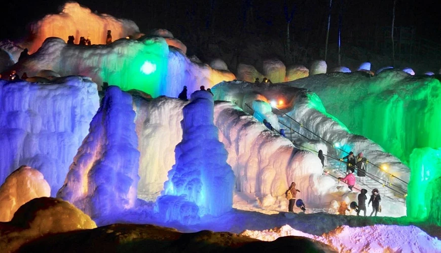 位於上川町的層雲峽冰瀑祭,是北海道最具代表性的冰雪祭典之一。會場以天然冰雪打造出冰之城堡、冰隧道與巨大冰雕,夜晚點燈更顯夢幻。遊客可一邊欣賞晶瑩剔透的冰雪藝術,一邊泡溫泉體驗極致的冬日享受。壯觀與浪漫兼具,是只屬於北海道冬季的限定盛景。