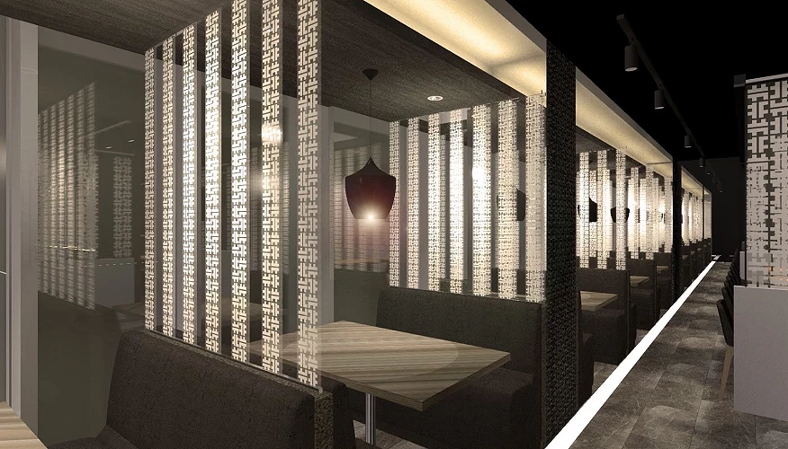 「北海涮鍋」的內裝走日系木質風格,搭配暖色調燈光營造出柔和溫馨的用餐環境,座位有半開放式包廂、和式包廂、桌椅包廂以及可以容納團體客的大型宴會包廂。和式包廂的桌子下方有挖空,對於不習慣日式正座或是盤腿坐的人來說是非常貼心的設計。靠窗的包箱可以欣賞到窗外的街景,入夜後還能眺望燈火通明七彩霓虹的繁榮市區,是一間能品美食賞夜景的餐廳。