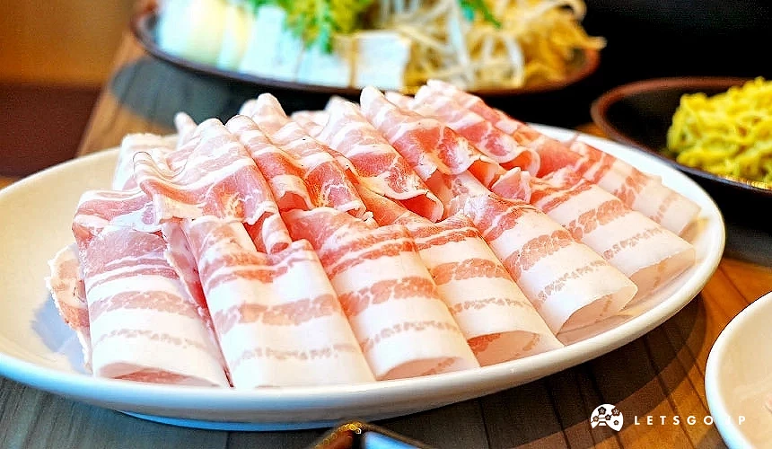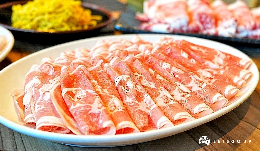 主餐點選豬肉的話,可以享用的北海道產的豬五花,豬五花跟羊肉和牛肉比起來一點也不遜色。雖然豬肉需要在鍋中煮至呈現全白才可食用,但師傅的好刀工在保留豬肉口感跟肉身厚薄上取得平衡,讓涮煮的時間得以縮短。道產的豬五花肉質軟嫩,脂肪馥郁,香甜卻不膩口。沾取秘傳醬汁之餘,不妨也試試看利用三種藥味(蔥花、蘿蔔泥等佐料)來增添不同的風味。