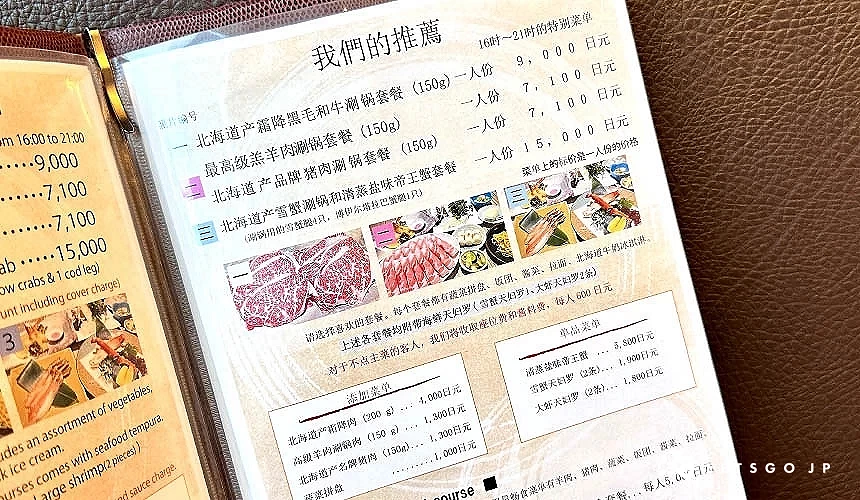 「北海涮鍋」提供的套餐分兩個等級,兩者內容最大的差異就在於雪蟹與大蝦天婦羅和甜點(北海道牛奶冰淇淋)。決定好套餐後要再選主餐的肉品,最推薦的是小羔羊!另外也可選黑毛和牛或香甜北海道產豬五花,甚至是海鮮鍋,選擇性多元,就算是一群親朋好友一起出遊,部分成員有飲食上的禁忌也不用擔心!以下就整理了菜色與對應價格,先來參考,到時候比照「北海涮鍋」內提供的中文菜單點餐就不會出錯啦