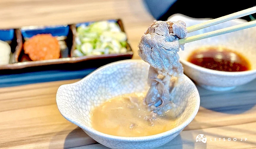 日本黑毛和牛可說是許多訪日旅客必吃的日本料理之一,尤其是最高規格數量稀少的 A5 黑毛和牛,更是深受老饕們的喜愛。而「北海涮鍋」提供就是這深受歡迎的 A5 霜降黑毛和牛,每一塊肉都切得相當大塊且完整,脂質遍佈均勻,漂亮的霜降油花看得出,肉品的品質相當高。牛肉與羊肉一樣,下鍋涮至變色就可以享用。和牛的肉質柔軟中但帶嚼勁,且愈嚼愈香愈多汁,唇齒留香。除了秘傳醬汁外,和牛跟胡麻醬也很合喔!