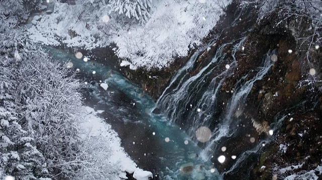 距離青池僅五分鐘車程的「白鬚瀑布」,是美瑛另一處令人屏息的夜間奇景。瀑布由地下湧水從峭壁縫隙中流出,水流與藍光交織形成深邃神秘的景象。夜間點燈活動的讓白鬚瀑布隨燈光色溫變化展現多層次美感,白霧飄散時宛如極光降臨,水花在燈光下閃爍,與美瑛川的碧藍河水融為一體。從橋上俯瞰,藍白相間的瀑布像一條銀龍蜿蜒於雪谷之中,壯麗又靜謐。自2018年起,白鬚瀑布的點燈成為冬季常設活動,時間與青池同步至21:00。