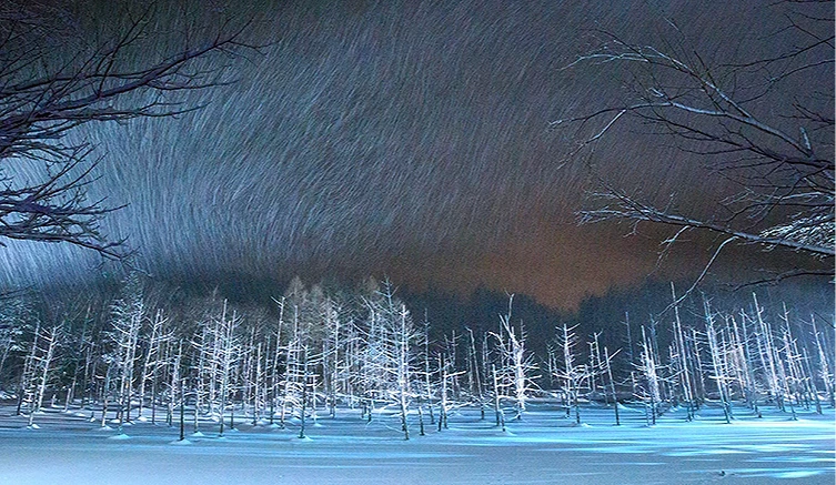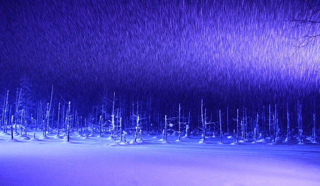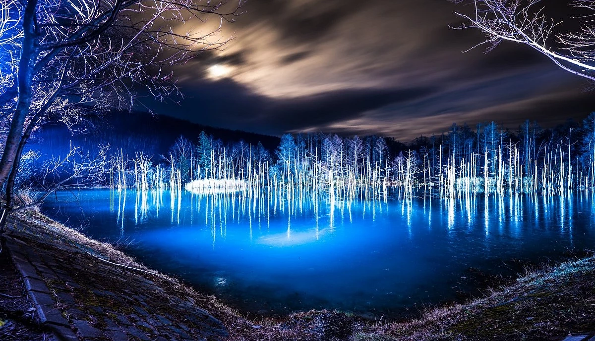 美瑛的「青池」以獨特的乳藍湖色聞名,冬季的它更添神秘氣息。當夜色籠罩,湖面結冰覆雪,燈光投射出柔和色彩,像一場緩慢流動的光之劇。枯木倒影與光影交錯,彷彿是大自然最詩意的呼吸。點燈的燈光由專業照明設計團隊打造,刻意避開人工感過強的演出方式,取而代之的是自然與寂靜的共鳴。即使寒風輕拂,也能聽見雪粒滑過樹梢的聲音。