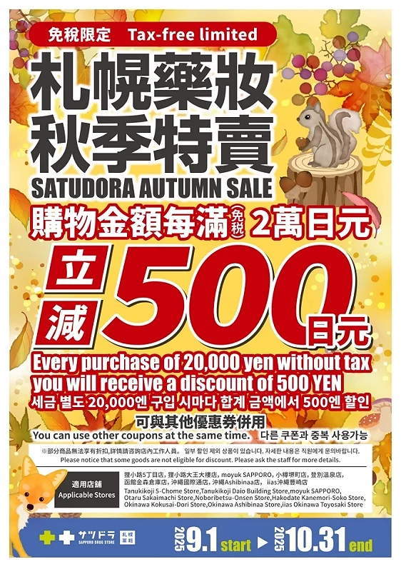 2025年9月1日起至10月31日止,只要在札幌藥妝指定店鋪每消費滿2萬日圓(未稅),除了免稅外,還能現折500日圓。若購物滿4萬日圓(未稅)則現折1,000日圓;滿6萬日圓(未稅)則現折1,500日圓,以此類推,買越多折越多!